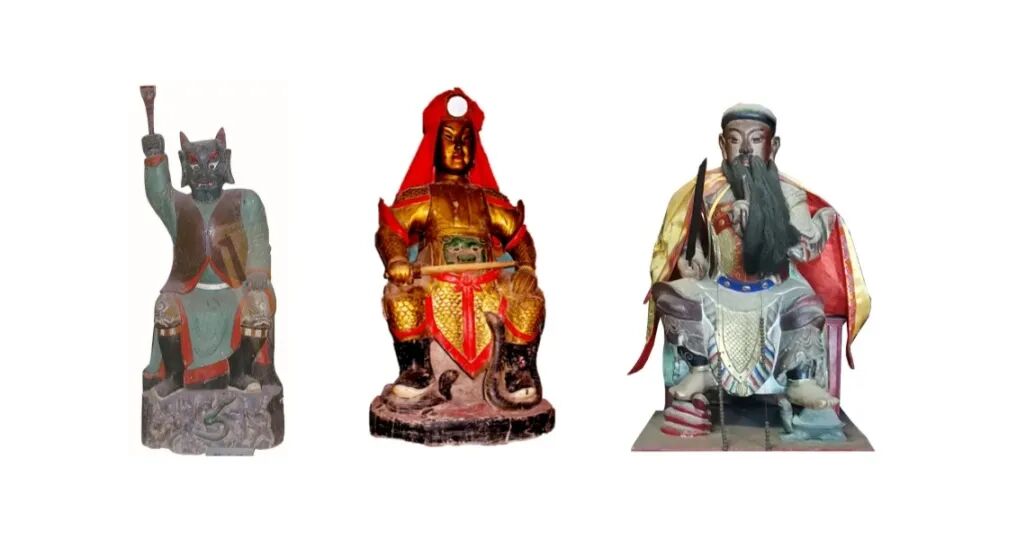 迄今,闽中长汀、连城、德化等地的许多“蛇王庙”“龙图宫”等蛇灵宫庙,仍保留着“镇斩蛇妖”的偶像崇拜。清光绪《长汀县志》卷二十六、二十七载,长汀府城西门外罗汉岭有“蛇王宫”一座,庙中供有蛇王菩萨像,蛇王形似一僧人,手中执有一蛇。厦门大学人类博物馆内藏一件长汀“蛇王像”,“蛇王”非蛇,而是手举棒槌、足下踩踏一只青蛇的黑面神灵。笔者在闽西连城、闽中德化先后调查到两座民间宫庙中都有情景相似的“镇蛇之神”——连城的一座宫庙中两条黑蛇被手持利剑的“定光佛”踩踏于脚下,德化“龙图宫”祭祀的“玄天上帝”偶像右手高举利剑、两脚分别踩踏红蛇与青龟(图九)。显然,这些庙宇所供奉的“蛇王”并非原初土著(蛇种)意义上的“蛇神”“蛇王”,而是高举刀剑、踩杀“蛇妖”的李寄、许君一类的“镇蛇之神”,是华夏、汉文化主导以“镇斩蛇妖”“扫除牛鬼蛇神”为特征的改造土著进行时。