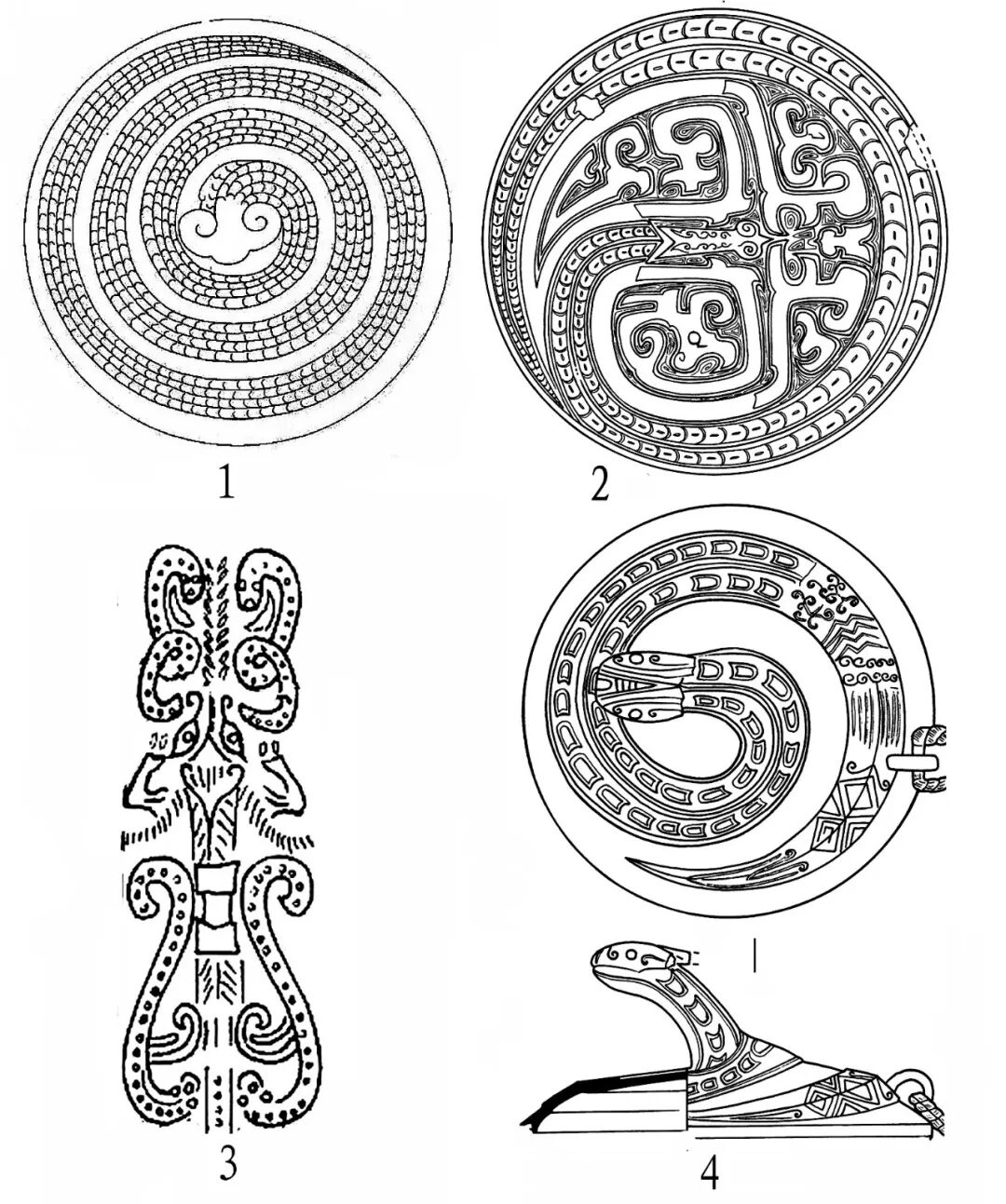 (1. 青阳汪村盘内鱼蛇纹;2. 繁昌汤家山盘内鱼蛇纹;3. 繁昌矛蛇纹;4. 繁昌汤家山盉盖蛇形纽)