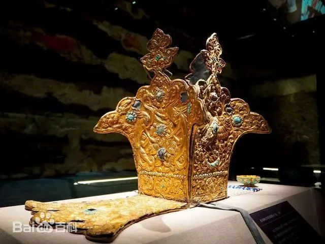 珍珠冕旒龙凤狮纹嵌宝石王冠为2019年出土于青海乌兰泉沟吐蕃时期壁画墓的珍贵文物,现藏于海西州民族博物馆 。该王冠与绿松石金杯同藏于墓室暗格木箱中,经近两年修复于2025年5月首次完整复原。采用激光焊接、X光与中子成像技术复原2582颗冕旒珠饰编串结构,王冠主体厚度不足200微米(约3张A4纸厚度),系我国首次成功修复吐蕃时期复杂造型王冠。