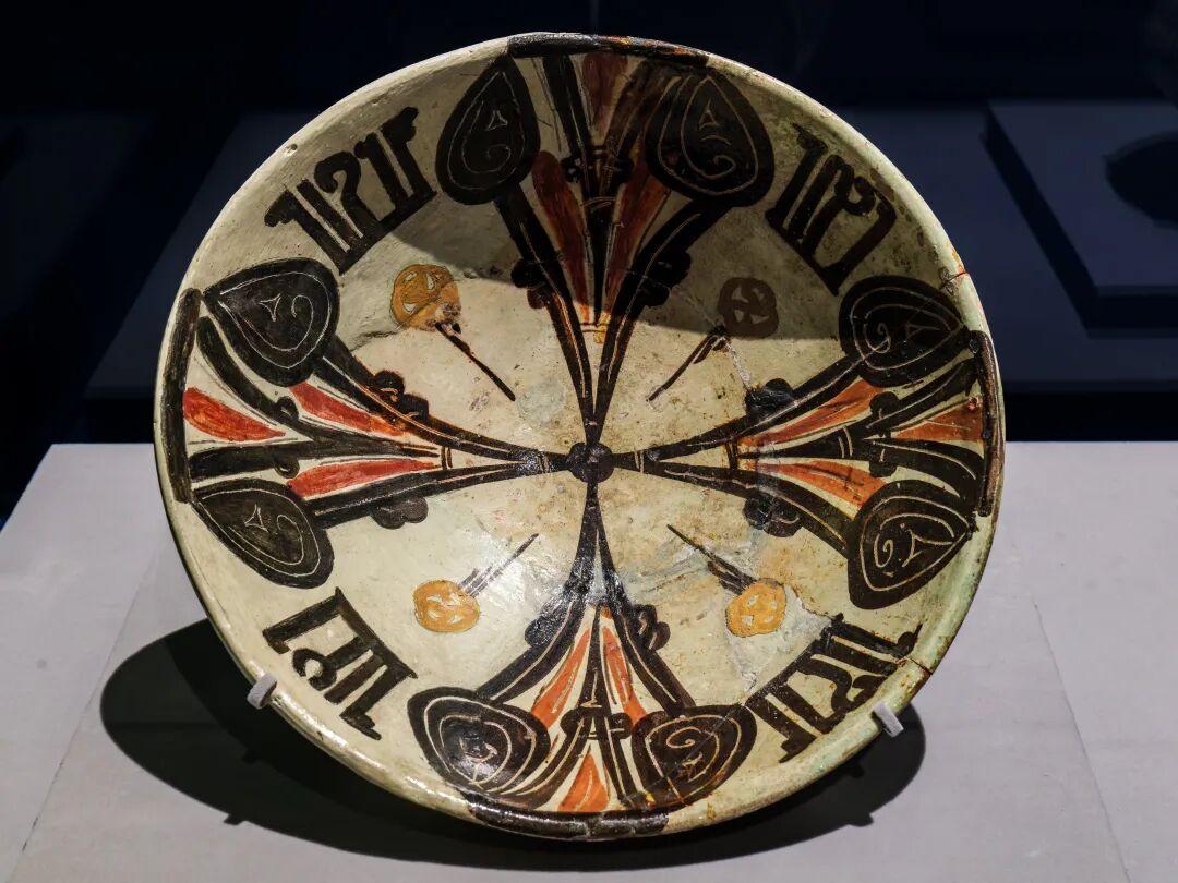 碗内用程式化的植物纹与铭文将碗底与口沿分为四个扇形区。在公元9一10世纪的塔什干釉陶装饰中,智慧箴言与美好祝愿占据重要位置。