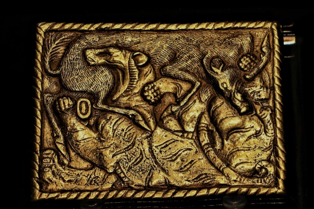 分类: 中文 遗产信息库 丝路文物 关键词:虎豕咬斗,金饰牌