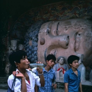 重庆31米卧佛前三个年轻人喝着汽水提着收音机,准备跳起80年代的disco▲重庆,1983年