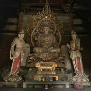 朔州崇福寺为三大辽金佛寺之一,始建于唐高宗麟德二年,由鄂国公尉迟敬德奉敕建造。金熙宗皇统三年,增建弥陀殿与观音殿。弥陀殿是崇福寺主殿,保存了初建时的建筑与壁画,是一个富有历史和艺术价值的古代文化宝库。殿为单檐歇山顶,总高约21米。殿身坐落在高大的台基上,基高2.4米,基前又有宽敞的月台,衬托得殿宇高大雄伟,瑰丽壮观。殿正面檐下,悬有“弥陀殿”竖匾一方,为金大定二十四年(1184)原物