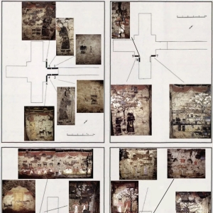 百子村东汉墓位于旬邑县百子村砖厂内,2000年砖厂取土时发现,同年10月到次年6月,陕西省考古研究所和旬邑县博物馆对砖厂的东汉墓地进行了发掘,其中M1是壁画墓。M1为长斜坡单天井墓道砖室墓,方向39度,由甬道、前室、东侧室、西侧室及后室构成,平面呈“十”字形,全长24.75米,深5米。前室近方形,穹隆顶,后室及两侧室长方形,其上为拱券顶。 壁画分 ...
