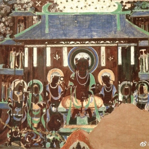 1. 隋代净土变隋代净土变的题材通常只有弥勒经变和药师经变,且往往一起出现在洞窟的窟顶位置。有建筑图像出现的是弥勒经变,目前可以看到的有5铺,分别为417、419、423、433和436,均为弥勒上生经变。位于419窟窟顶的弥勒经变(图1,图2)可以作为这一题材的标准图式:中央一座单层大殿,弥勒与众菩萨端坐殿内,大殿两侧有多层楼阁,阁中众天女手执乐器, ...
