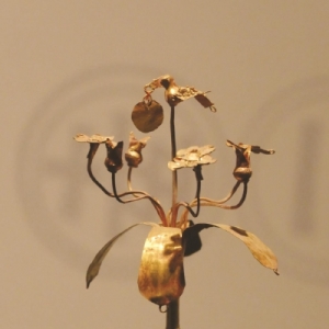 两汉魏晋南北朝时期流行于中原和南方的步摇花或简称步摇,与北方地区的步摇冠虽然系缀摇叶的做法相似,却是各有发展演变的线索。步摇花依然是女子首饰,大约只是把来自异域的摇叶移植到原有的簪钗中。后世“步摇”之名则沿续它本来的发展线索成为簪钗样式之一种,即簪首或钗首饰物有“步则摇动”之意趣的一类,并且随簪钗风格的演变而不断翻新。