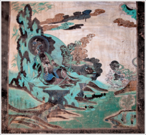 榆林窟第2窟水月观音画像,位于窟门两侧,各一铺,西夏绘制。北侧画面为:碧波之旁,异石突起,“虚白光中”一观音菩萨 珠宝为饰,璎珞垂胸,金体为身(上身贴金),方颊丰颐,雍容华贵,作“自在座”式(一腿屈,一腿盘)席地而坐于盘石之上。背有竹石,左置文房四宝,右有净瓶、柳枝、供器陈于石桌上。面前流水潺湲,莲花盛 开,菩萨若舒腿,则莲花承足 ...