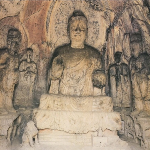 隋唐时代,以洛阳为东都。武则天称制,改洛阳为神都。唐代佛教石窟造像艺术空前繁荣,上自帝王将相、后妃公主,下至僧尼大众、庶民百姓,纷纷造像乞求功德。造像工匠,除政府控制的以外,还出现了商业性的自由工匠。唐太宗第四子——魏王李泰,为其亡母长孙皇后做功德开凿了阿弥陀佛造像一铺,这就是宾阳南洞的正壁造像,完成于公元641年。在窟门外侧有摩 ...