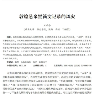 敦煌悬泉置简文记录的风灾王子今摘要:汉代丝绸之路沿线的生态环境形势,是实现东西文化交流的重要条件。“水草”,即水资源和植被状况,以及野生动物分布的情形,都成为丝路交通的生态环境保障。而气候条件尤其重要。气候因素必然会对水资源和自然植被的形态产生影响,无疑也制约着野生动物的生存,亦直接作用于社会生活和社会生产以及丝绸之路交通条件。 ...