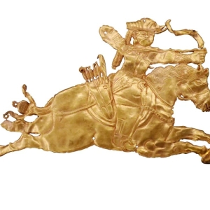 哈萨克斯坦Eleke Sazy河谷出土饰突厥可汗像金带扣2023年12月,哈萨克斯坦考古学家Zainolla Samashev教授公布其团队在Eleke Sazy河谷西突厥王陵的新收获,其中一对人物纹金带扣引人瞩目。带扣呈贝壳形,宽约3.7厘米,中央塑造头戴宝冠、手持酒盏、于对马宝座上威严垂足的游牧王侯,左右下方塑造手捧金盘、单膝跪地的侍者,据Samashev教授解读,或表现可汗接 ...