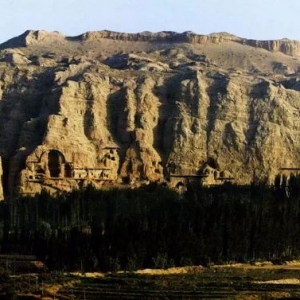 克孜尔石窟谷西区外景 克孜尔石窟位于新疆维吾尔自治区拜城县克孜尔乡东南七公里木扎提河(渭干河)北岸、却勒塔格山对面的明屋塔格山断崖上。克孜尔石窟现存洞窟339个,壁画近4000平方米,以及少量的彩绘泥塑遗迹,是龟兹石窟的典型代表。克孜尔石窟大约建于公元3世纪,止于公元8~9世纪,是我国开凿最早的大型石窟群,与甘肃敦煌莫高窟、山西大同云冈石窟、河南洛阳龙门石窟并称为我国四大石窟。1961年,克