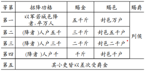 1981年在敦煌酥油土汉代烽隧遗址出土的木简,内容主要有诏书、律令、檄书、日常屯戍簿册、字书、兵书、历书、私人书启以及其他杂简。其中发现的“击匈奴降者赏令”数简引起了专家和学者的关注。笔者参照“赏格”的定义,结合历史文献和当时时代背景考察“击匈奴降者赏令”,认为实质上可以认定“击匈奴降者赏令”是一则具有早期形态的招降赏格。此外,在日 ...