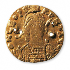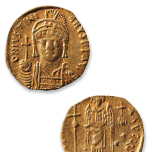 第五枚金币出土于田弘棺头盖骨旁出土,经考证为东罗马皇帝查士丁尼一世大帝期(Justinian I,the Great,527~565年在位)的金币。金币直径1.65厘米,重2.5克,金币的边缘被剪。金币的正面为半身皇帝头像,头戴皇冠,耳周有吊饰,身穿交领铠甲,右手持一十字架。金币的周边有一圈字母铭文:DNIVSTINI/ANVSPPAVI。即:DN(Dominus Noster,我们的主 ...