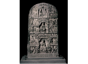 麦积山石窟133窟10号碑 10号碑现存放于麦积山133窟中,高1.36米,宽0.73米,厚0.10米。它将众多的佛法故事以浮雕的手法集中雕刻在一块碑上,故称为佛传碑。它的正中的三个大格分别绘制了释迦多宝并坐说法、交脚菩萨、释迦说法等画面,两侧的小格分别绘制了燃灯授记、乘象入胎、树下诞生、深山修行、树下思维、初转法轮、降魔成道、维摩辩法、佛 ...