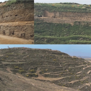 This figure shows images of the step pyramid. a) part of the stone buttresses of the second and the third steps of the pyramid; b) eye symbols that decorate the pyramid c) a view of the buttresses under excavation; d) a general view of the pyramid before
