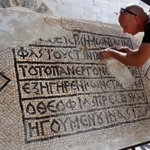 An archaeologist works on part of a 1,500-year-old mosaic floor bearing the names of Byzantine Emperor Justinian, at the Rockefeller Museum in Jerusalem, on August 23, 2017 (AFP Photo)A 1,500-year-old mosaic floor with a Greek inscription has been uncover