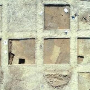 Aerial photo shows the excavations of circular building bases in the Yanshi ruins, Henan province, Central China. The site of a group of circular building foundations, which are believed to be the state barns of the Shang Dynasty (1600-1046 BC), has been