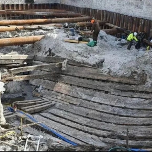 强大的汉萨同盟或为这艘货船的拥有者在考古发掘基坑中出土的中世纪货船,拍摄于船首方向。(图片版权:布里特·拉缇)建筑工人在爱沙尼亚首都塔林路面下发现了此距今700年的残损货船遗迹。船体残骸埋藏于地下约5英尺(1.5米)处,由橡木制成,长约78英尺(24米),附有船梁。船体最宽处,贯穿长约29英尺(9米)。“这艘船原始宽度要更大,因为艏柱(船头的 ...