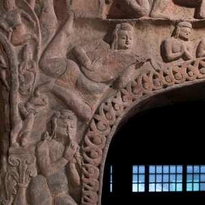 第8窟是云冈石窟中期洞窟开凿最早的洞窟之一,雕刻题材丰富多样,装饰配置复杂繁缛,特别侧重于护法形象和各种雕饰绮丽的装饰,大量融进西方佛教艺术因素,在石窟艺术的创新发展中,具有设计新颖、雕刻细腻、中西合璧、式样多元的特点。此窟后室南壁窟门拱额两侧分别雕刻二身的伎乐天人像,上下排列、左右对称,这四身伎乐天均置于忍冬纹拱沿外侧,忍冬纹 ...