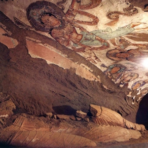 文殊山石窟目前有壁画的洞窟五个,分别是位于前山区的第19窟(万佛洞)、第29窟(前山千佛洞)及第31窟(文殊寺),位于后山区的第69窟(后山千佛洞)、第73窟(古佛洞)。自北魏开窟之后,经历唐、西夏、元、明清不同时代、不同程度的重修,存在各种叠压关系。第69窟(后山千佛洞)顶部复原图第69窟(后山千佛洞)顶部线描图文殊山石窟中的飞天充满了动态 ...