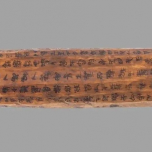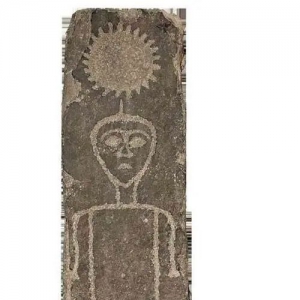 城背溪文化“太阳人”石刻 长115厘米,宽20厘米,厚12厘米 1998年湖北秭归东门头遗址出土 “太阳人”石刻图案刻在一块长方形石条上,石质坚硬,两面平整。用写意的手法雕刻出一位身材修长、两手下垂、双足分立的神人。神人头顶上刻有23条光芒的太阳,人像腰部两旁分别刻画星辰。这幅图案是目前在我国境内发现最早的一件新石器时代的太阳崇拜 ...