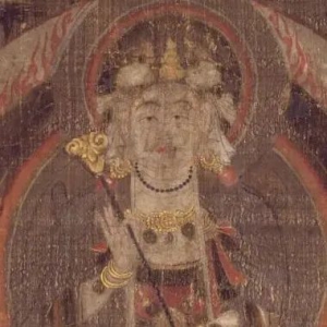 延寿命菩萨像北宋绢本设色高72公分 宽59公分敦煌莫高窟第17窟藏经洞出土法国吉美国立亚洲艺术博物馆藏在描绘于近方形的平织粗绢布上,图左侧长方形黄色榜题墨书“南无延受(寿)命菩萨一心供养”,右侧长方形红色榜题并无书写文字。主尊菩萨戴宝冠,佩戴以金泥绘出的耳铛、项圈、腕钏,结跏趺坐于白莲座上。右手持长柄如意,前端作金色花形,左手掌心托如意 ...
