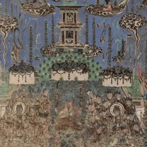 敦煌321窟北壁初唐壁画《阿弥陀经变》这幅阿弥陀经变占了整面墙壁,《阿弥陀经》又被称为小《无量寿经》,主要描述了西方净土无比庄严、清静、美妙和安乐、祥和的景象。上部碧波蓝空,天水相接,十身飞天千姿百态;乘云驾雾的赴会佛和菩萨表示的是十方诸佛和菩萨赴无量寿佛说法会场面,呈对称结构分布在天空层,有五座楼宇殿阁,四组一佛二菩萨组合;在主 ...