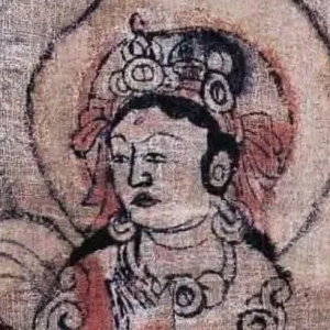 延寿命菩萨像五代麻布设色高74公分宽35公分俄罗斯圣彼得堡艾尔米塔什国家博物馆藏敦煌市莫高窟第17窟藏经洞出土。幡身绘菩萨一尊,双手合十,束圆髻,戴珠形宝冠,佩耳环、项圈、腕钏。身披红色络腋,似披云肩,帔巾绕臂飘展。菩萨足下莲台未施晕染,而以红色点染莲瓣前端。幡头非以另一块麻布接缝,而是直接以墨线绘出三角形代替,内画花朵。菩萨头光右侧 ...
