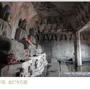 据康熙年间的《平顺县志》记载,金灯寺始建于北齐,隋、唐、五代、宋、元历代重修,原名宝岩寺,到元代泰定年间改称金灯寺。石窟开凿于山巅自然形成的石凹内,现存石窟开凿年代从明弘治十七年(1504年)起,至明嘉靖四十四年(1565年)止,历时60余年。金灯寺石窟中的人物造像,形体秀美,装饰富丽,承
