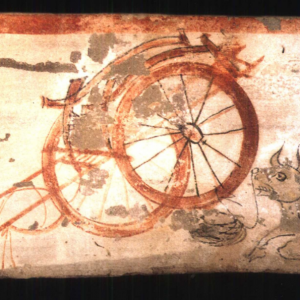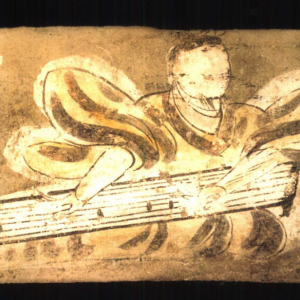 伏羲和女娲是中国古代神话中的人类始祖。此画像砖呈方形,四周饰白色边框。画面中央用白色涂底、彩绘一伏羲图像。伏羲人首蛇身,右手持规,头戴山形冠,胸部有日轮,中有呈飞翔状墨鸟,为传说中运载日至日出的阳鸟,又称金乌。