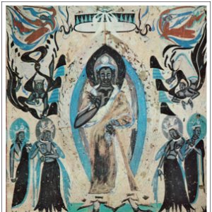 莫高窟第249窟说法图,位于北壁中部,西魏绘制。立佛居中,身着右袒袈 裟,右手扬掌,左手握衣,庄严肃立。两侧各二身菩 萨,着右袒袈裟,或半裸着裙。菩萨身段苗条,肢体柔软,姿态忸怩,显得温婉妩媚。佛上方高悬饰有兽头和双凤的华盖,垂挂玉佩羽葆装饰的流苏。华盖两侧流云中有四身飞天,上面的一对容貌清秀、身材修长,身穿大袖长袍,挥袖蜷腿,舞姿 ...