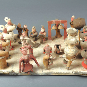 1969年4月,群众在济南市的北郊无影山发现古墓,及时报告政府。山东省和济南市的文物工作者迅速赶往勘察,共发现清理了14座墓葬,在其中的11号汉代早期墓中出土了西汉彩绘杂技乐舞陶俑。此件彩绘杂技乐舞陶俑现在是济南市博物馆三大镇馆之宝之一。它是一个迷你版西汉欢歌宴饮场景的再现。所有歌、舞、杂技、乐、观赏俑和各类乐器,安置在一个长67厘米、宽4 ...