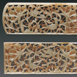 雉鸡牡丹纹镂空玉带板,1958年出土于兰州上西园明墓,青灰色和田玉镂雕而成,包括三台1、小辅4、圆桃4、插尾2、排方7,均透雕牡丹花枝,边缘有界栏。其中四块较大的长条排方,雕饰最为精美,于繁华密叶间配置一对雉鸟,构图繁缛,富于变化,显示出匠师高超的技术造诣,也是明代玉雕的匠心之作。(一) 说起“玉带”,首先人们联想到的就是传统戏曲中的 ...