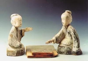 时代:汉代 出土地点:武威市珍藏单位:甘肃省博物馆 彩绘木雕博戏俑出土于甘肃省武威市磨嘴子汉墓,以其精绝的构思和卓越的雕技而享有盛誉,被定为国家一级文物,现藏于甘肃省博物馆。彩绘木雕博戏俑(局部) 彩绘木雕博戏俑由两个跪坐老者和一棋盘构成。松木雕刻。一俑高29.1厘米,宽15.5厘米;一俑高26.7厘米,宽14.6厘米。棋盘长29.2厘米,宽19.3厘米。对弈老者手脸涂白,墨线勾勒面部五官,交领袍衣灰色为底,白色粗线勾 ...