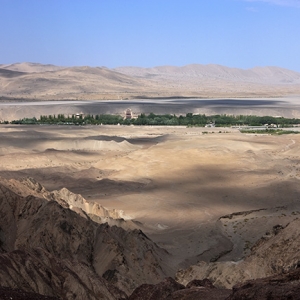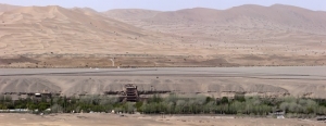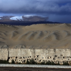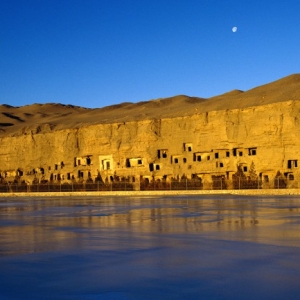 著名的莫高窟在敦煌城东南戈壁尽头一个小山沟外沿,当人们从敦煌市到莫高窟的二十多公里路途中,经过了约十五公里开阔而荒凉的戈壁,行进在茫茫戈壁中,当眼前远远看见一片不大的绿洲时,多少会让人们有点惊异,同时也告诉你,莫高窟将要到了。待你进入莫高窟的窟区,一片参天的杨树和有着几百年树龄的大榆树与珍贵的宝窟相伴,令人陶醉在生机勃勃和古老的文明气息之中。在绿树浓荫环绕之间,透露出石窟对面的远山,峥嵘险峻,荒凉 ...