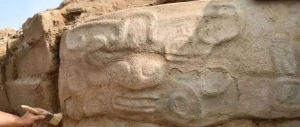 陕西石峁遗址皇城台发现大型人面石雕陕西石峁遗址又有考古新发现,考古工作者日前在石峁遗址的核心区域皇城台的大台基护墙上新发现了一件大型人面石雕。石雕本体呈圆弧形,镶砌于皇城台大台基西南角的墙体之上。目前这件石雕已发掘出两个相邻的人面浮雕,两个人面保存状况较好,神态庄严肃穆,均戴有耳珰,呈现双目略突出、阔嘴呲牙的表情,其中西侧人面长 ...