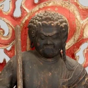 不动明王立像平安时代 11世纪木造、彩色像高166.1 厘米 背光高236.4厘米 台座高40.6厘米东京国立博物馆藏不动明王,即使在空海法师请来的密教尊像中,也是造像机会极多的法像之一。初期的不动明王像双目圆睁,上面一排獠牙外露,但平安时代后期大量制作不动明王立像则为左眼半睁,嘴唇上下各露獠牙的相貌,此像便是其中一例。此像的卷发亦为平安时代后期以 ...