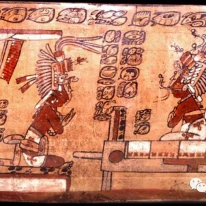 这是展品中最精美的彩绘陶杯之一,生动描绘了玉米神在冥界大获全胜的场面。 画面正中是玉米神孪生兄弟(也可能是玉米神的儿子英雄孪生兄弟)和两位冥界死神。玉米神兄弟以王者的交叉腿之姿端坐在两侧的步辇(litter)宝座之上,充满胜利者的快意。日常步辇较简单,这种有华盖和背板的步辇是王者的重要仪仗,常在战争场面出现。两乘步辇分别以骷髅和人头为饰,表现出冥界的主题。 左侧死神为典型的骷髅之身,脚下踏两块圆石 ...