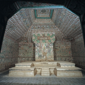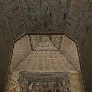 第45窟 洞窟内景第45窟位于莫高窟南区中段下层,虽无明确的造窟功德记和文献记载,但从洞窟形制、壁画内容和艺术风格看,其营建时间应在盛唐时期。此窟平面方形,覆斗藻井顶,团花井心,四披画千佛。窟正壁(西壁)开一平顶敝口龛,龛内塑佛、弟子、菩萨、天王七身像。南壁画观音经变。北壁画观无量寿经变。前壁(东壁)门两侧壁分画观音、地藏菩萨像等。北壁东侧 未生怨北壁西侧 十六观正壁敞口龛内的塑像是此窟的重点,是唐代雕 ...