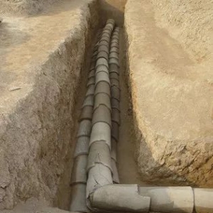 2006年,秦阿房宫前殿遗址东北处,约500米远的战国秦上林苑五号建筑遗址中,发现了一处地下排水管道。这些管道通身陶制,厚度不过1cm,长度在58cm左右,一端直径小一端直径较大,然后大小口径相互嵌套连接而成。水管下层铺两条,上层铺一条,横剖面呈“品”字型,内里还有简单的纹饰。战国秦上林苑五号遗址第一组管道(现存于西安博物院)这样的陶制排水管道,在战国上林苑遗址多处均有发现,可以说明战国秦汉时期,