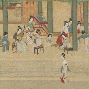 此《汉宫春晓图》卷由明代画家仇英绘,中国十大传世名画之一。该图用手卷的形式描述初春时节宫闱之中的日常琐事:妆扮、浇灌、折枝、插花、饲养、歌舞、弹唱、围炉、下棋、读书、斗草、对镜、观画、图像、戏婴、送食、挥扇,画后妃、宫娥、皇子、太监、画师凡一百一十五人,个个衣着鲜丽,姿态各异,既无所事事又忙忙碌碌,显示了画家过人的观察能力与精湛的写实功力。人物皆唐以来衣饰,取名汉宫,是当时对宫室的泛指。此卷为绢本