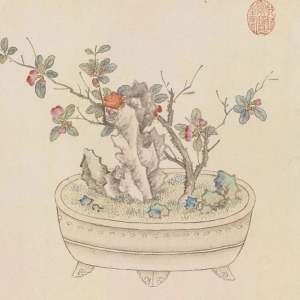 此《画万年花甲》图卷由清代画家汪承霈绘制。全卷共绘二十四种花木盆景,分以陶瓷、铜制盆盎安置,设色工丽端整。画家笔下独具匠心不同款式的盆栽花树,呈现雅俗共赏特色。四季花卉同时开花结实,代表政治清明,德被草木,具有“百花呈瑞,盛世升平”的祥瑞寓意。此卷绘制于清乾隆四十九年,现藏于台北故宫博物院。汪承霈(?-1805),字受时,一字春农,号时斋,浙江钱塘人。乾隆十二年(1747)举人,历工部左侍郎、兵部
