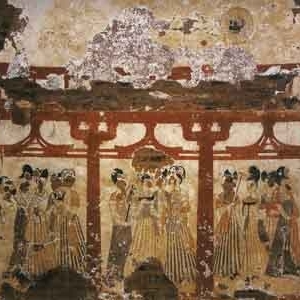 服装是社会政治气候、经济基础的晴雨表。唐代是中国封建社会的鼎盛时期,政治的稳定、经济的发达、生产和纺织技术的进步、对外交往的频繁等促使服饰空前繁荣,服装款式、色彩、图案等都呈现出前所未有的崭新局面。唐·阎立本《步辇图》西域自古以来就是多民族聚居区,也是中原文化与西域及西方文化相互交融的枢纽之地。唐朝政府对西域的有效管理及影响,使西域服饰特别是女子服饰呈现出多姿多彩的风貌。吐鲁番阿斯塔那墓出土的文物