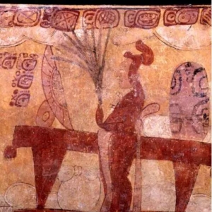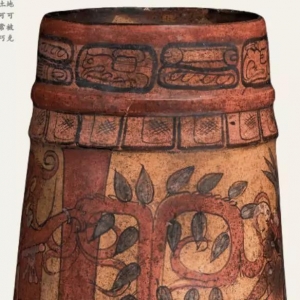 展品中一件雕刻精美的白陶小口瓶应该是存放烟草的。美洲是烟草的原产地,玛雅时期,吸烟既是休闲享受,也是仪式活动中达到致幻状态的重要方式,展览中的两件彩陶杯就表现了这样的场面。吸烟的方法可以是这两件陶杯上的人物那样卷成雪茄直接吸食;也可以是加工后放入精致的小瓶子里,需要时取用。科尔K3460号陶杯就描绘了这一特殊的享用方法。画面中间的黑裙女子右手托一装有烟膏的小黑瓶,左手持一长针,挑出烟膏,送到对面博 ...