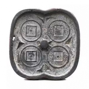 货泉铜母范正面货泉铜母范背面文物名称 “月氏”铭货泉铜母范 ▲新莽时期(公元8年-公元23年) ▲崇信县黄寨镇马寨村 范平面略呈方形,周有边框。范高0.64厘米、周长24.5厘米。范面中间有一凸起的圆形平顶、底部呈“×”字形状纽将范面分为两部分,共列钱4枚,左为钱背,右为钱面,钱面阳文篆书“货泉”二字。范面右侧上下右边各有三角形凹槽1个,左侧上下