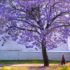 每当普那卡宗的蓝花楹盛开的时候,我不知道吾谨师傅会不会想起那个遥远的下午,三十年前的某个春日,他也像画面中的小僧人一样,在同样的树下经过。四季流转,花开花落间,从踏进宗堡到四方求法,路越远,心越静。就像这风中怒放的蓝花楹,虽花香渐逝,却记忆永存。撰文、摄影:李烨蓝花楹盛开的普那卡宗在翻越多楚拉山口时,那一百零八座佛塔沐浴着史诗的光泽,脚下的野雏菊悄然绽放。沿着春天的山谷,我从廷布驱车前往普那卡宗,