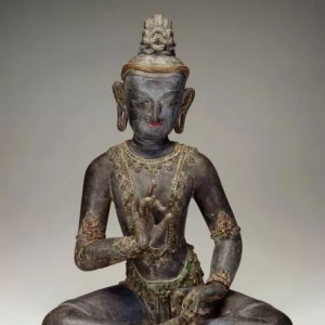 十三世纪 元代招募的尼泊尔艺术家阿尼哥造夹纻干漆 尺寸:58.5 x 43.3 x 29.5 cm美国史密森尼博物馆收藏 隆日编译 此像是元代招募的尼泊尔艺术家阿尼哥所造。关于阿尼哥的事迹参见本文结尾处的《延伸阅读》。 菩萨面相端庄,五官秀美,面露微笑,神态安详,法相庄严。身佩项圈璎珞、挂链、臂钏、腰饰、手镯及足钏等饰品庄严全身。袒上身,下着贴体短裙,右手当胸结印,呈三折姿自在安坐在法座