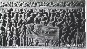 克孜尔的涅槃图像在吸收了犍陀罗这一相同题材的艺术表现风格因素之后,又开启了新的表现方法格局与图像风格。既表现在图像的整体布局也表现在细部的表现样式上。在克孜尔230余个洞窟中,至少有占1/4的洞窟中绘有涅槃图。由此看来,涅槃图像在克孜尔是受到极大重视的题材。送葬 浮雕 犍陀罗地区 巴基斯坦白沙瓦博物馆藏克孜尔中心柱窟后室普遍塑涅槃佛或画关于佛涅槃以及弟子举哀、荼毗的图像,这是其一个显著的特点。有代
