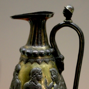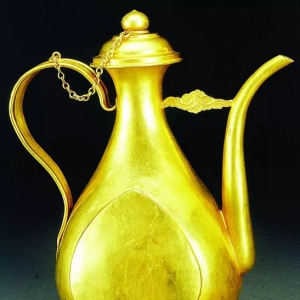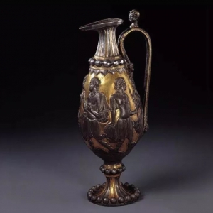 ▲ 北周 鎏金银壶1983年宁夏固原李贤夫妇墓出土,固原博物馆藏这件鎏金银壶(又称鎏金银瓶)通高 37.5 厘米,最大腹径 12.8 厘米,重 1.5 千克。器物为银质,表面鎏金,环形单把,把上方铸一头戴帽子、高鼻深目的人头。壶嘴为鸭嘴状,细长颈,上细下大,颈部与壶腹相连处有一圈凸起的连珠纹。而壶腹上的图案更是奇特。壶腹上有六个人物,两两一组分为三组。第一组为一男一女相对,男子一手握着女子的手腕,