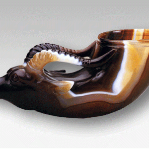 镶金兽首玛瑙杯,是唐代中外交流的产物。1970年西安市南郊何家村出土。兽首玛瑙杯,是至今所见唐代唯一的一件俏色玉雕,也是唐代玉器作工最精湛的一件,如此神奇自然的变化,如此鲜润可爱的色泽,使这块红玛瑙成为世间稀有的俏色玉材。玛瑙杯的玉石材料是罕见的以红色为主调,中间还有一层略呈红润乳白色夹心的缠丝玛瑙。工匠巧妙利用材料的自然纹理与形态“取势造型,依形布局”、“依色取巧,随形变化”。其小端雕琢成活灵活现的 ...